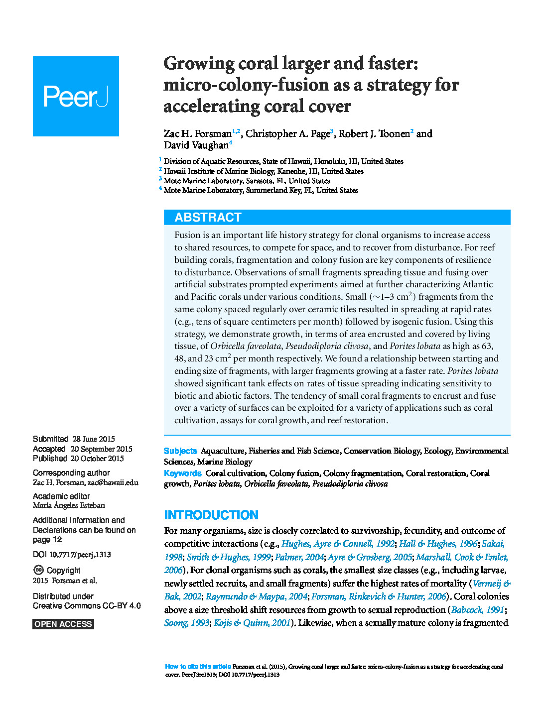 Abstract: Fusion is an important life history strategy for clonal organisms to increase access to shared resources, to compete for space, and to recover from disturbance. For reef building corals, fragmentation and colony fusion are key components of resilience to disturbance. Observations of small fragments spreading tissue and fusing...