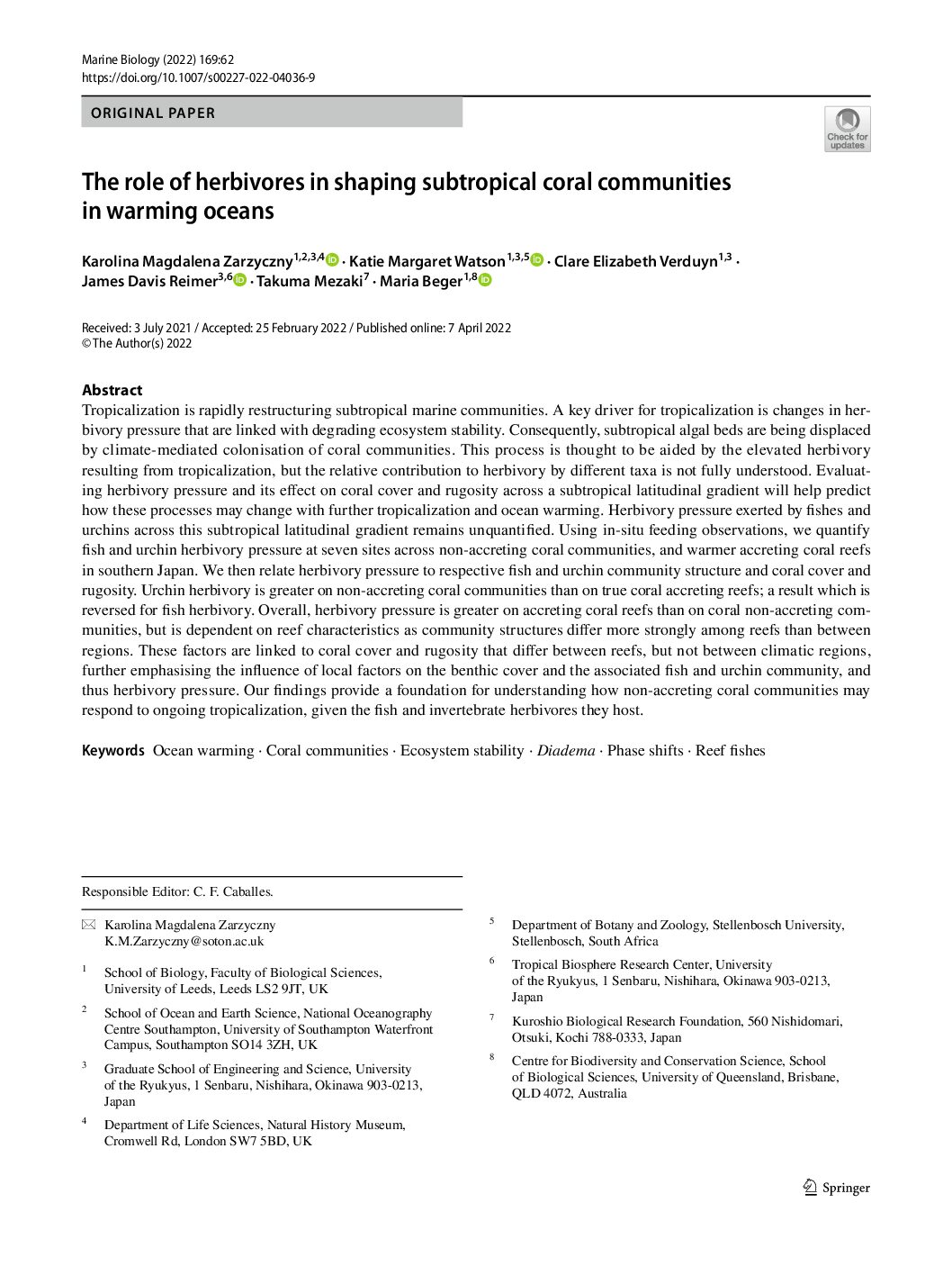 Abstract: Tropicalization is rapidly restructuring subtropical marine communities. A key driver for tropicalization is changes …
