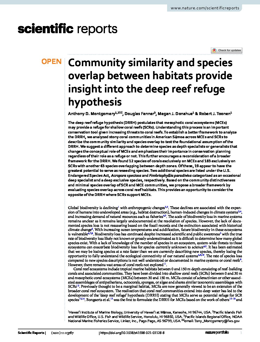 Abstract: The deep reef refuge hypothesis (DRRH) postulates that mesophotic coral ecosystems (MCEs) may provide …
