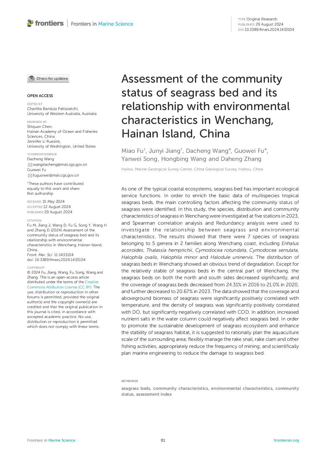Abstract: As one of the typical coastal ecosystems, seagrass bed has important ecological service functions. …