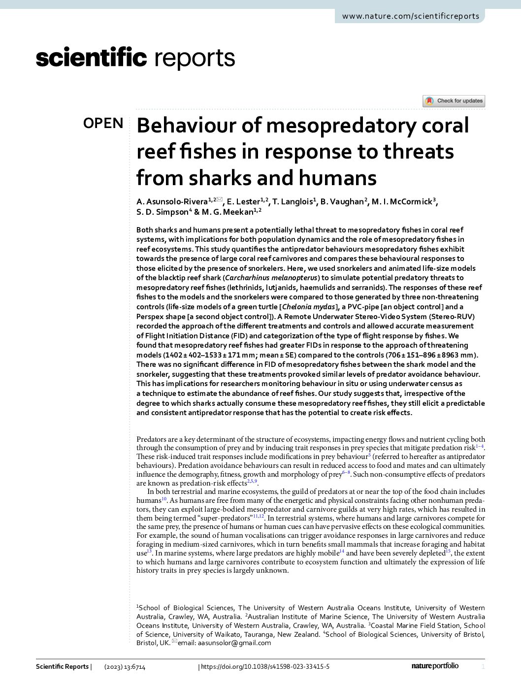 Abstract: Both sharks and humans present a potentially lethal threat to mesopredatory fishes in coral …