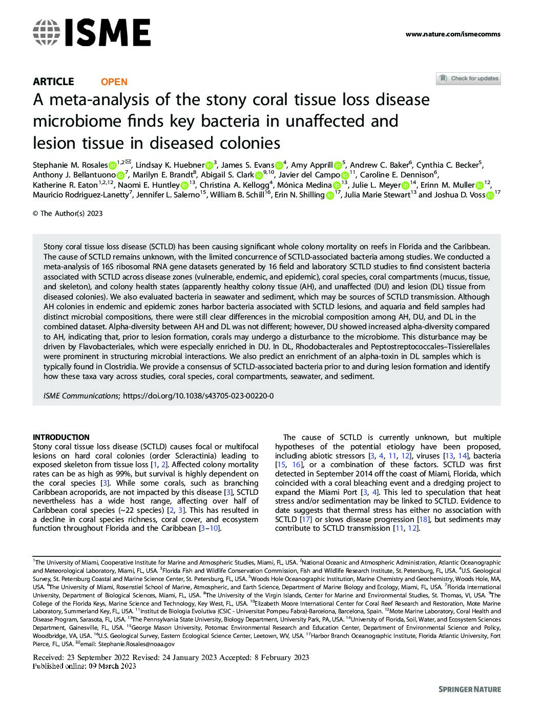 Abstract: Stony coral tissue loss disease (SCTLD) has been causing significant whole colony mortality on …