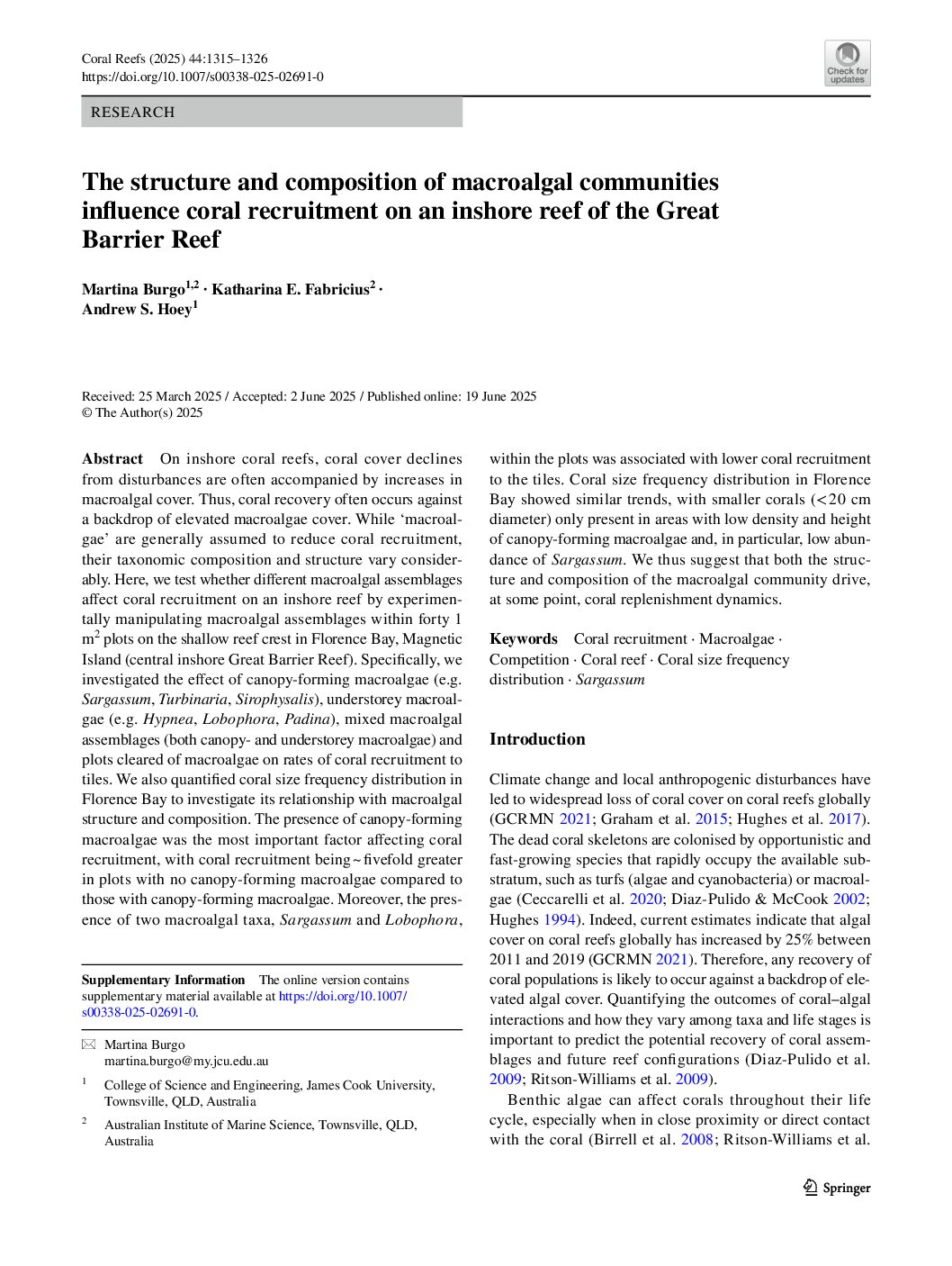 Abstract: Coral cover and recruitment have decreased on reefs worldwide due to climate change-related disturbances. …