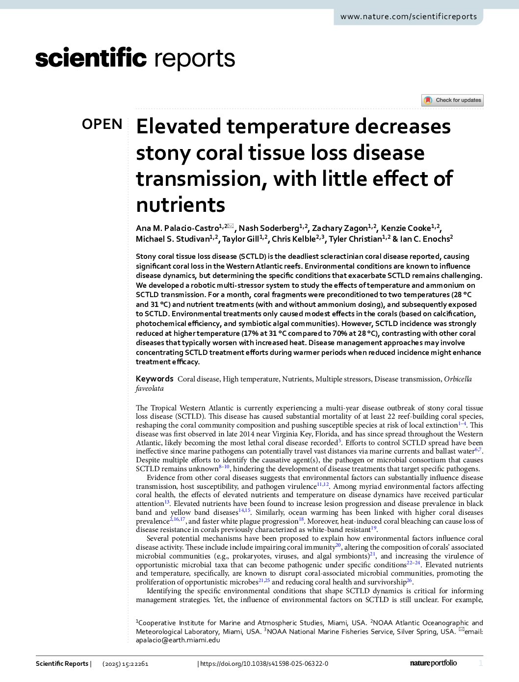 Abstract: Stony coral tissue loss disease (SCTLD) is the deadliest scleractinian coral disease reported, causing …