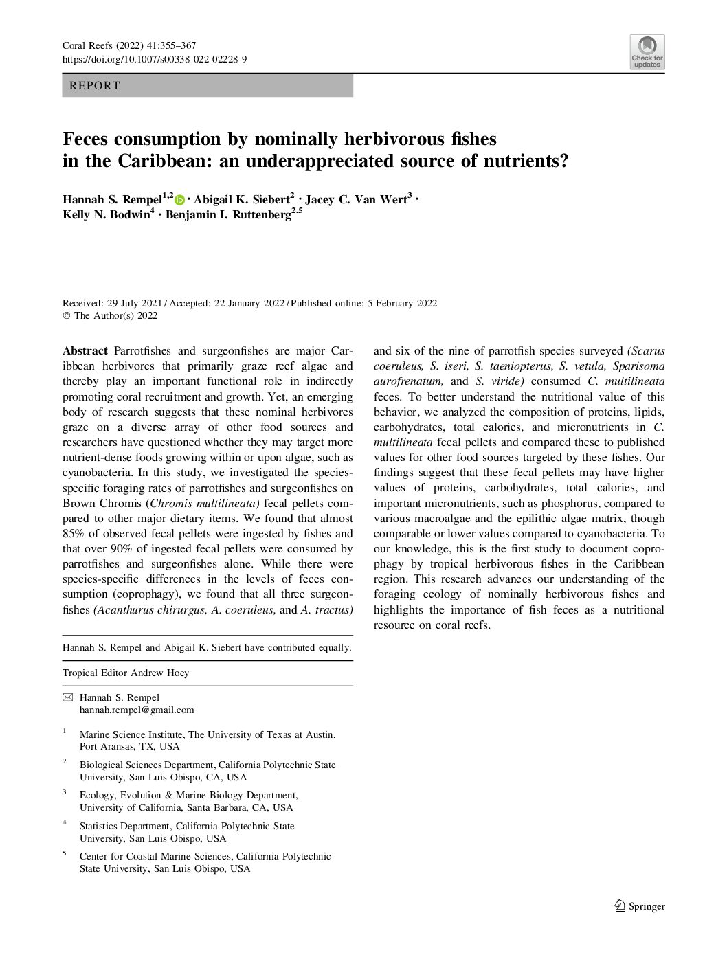 Abstract: Parrotfishes and surgeonfishes are major Caribbean herbivores that primarily graze reef algae and thereby …