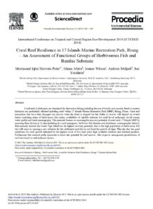 Coral reefs in Indonesia are threatened by destructive fishing including the use of bombs and cyanide. Reefs in eastern Indonesia are particularly affected including reefs within 17 Islands Marine Recreation Park (MRP), Riung, Flores. Coral reef ecosystems that have been damaged can recover when the threat is stopped but the ability to recover will depend on several factors including status of herbivorous fish stocks, availability of suitable substrate for coral larval settlement, larval source, water quality and local oceanography. This research focuses on assessing the recovery potential of coral reefs 17 Islands MRP by assessing these factors at 12 sites including [i.e coral emergence, herbivore fish biomass and abundance, oceanographic factors]. This research showed that South Tiga Island has the highest recovery potential, due to the high population of herbivorous fish that will assist in opening a new substrate for the settlement coral larvae and limit the growth of algae. This site also has good conditions for coral growth indicated by the highest cover of live hard coral, high available substrate and sheltered position. Furthermore this research really important to know site potential for reef recover. Also improve management prioritization of reef sites based on reef resilience factors.