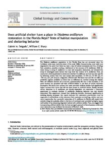 The Diadema antillarum population in the Florida Keys has not recovered since the Caribbean-wide mass mortality event of the early 1980s. Concomitantly, coral reefs have degraded to the point that there has been a loss of habitat complexity and thus of refuge from predation, possibly creating a bottleneck to the recovery of D. antillarum. With interest rising in using D. antillarum in coral reef ecosystem restoration, we initiated this study to investigate some factors that may limit the survival of D. antillarum. First, we conducted a field experiment to determine whether D. antillarum survival was size-specific by tethering urchins from four size classes (test diameters: 21e30 mm, 31e40 mm, 41 e50 mm, and 51 mm) on a degraded, offshore reef. We found that size did not offer any protection against predation as there was no difference in survival among size classes. Next, we tethered another set of urchins, approximately 60 mm in test diameter, at the same location but provided half with artificial shelter in the form of halved terracotta flowerpots. We found that urchins that were provided artificial shelter had significantly higher survival than those that did not have access to artificial shelter. Finally, because certain behaviors in D. antillarum are density-dependent, we conducted a laboratory experiment to evaluate whether D. antillarum sheltering behavior was also density dependent. This experiment showed that sheltering behavior decreased significantly as stocking density increased. Our results indicate that restoration practitioners must be cognizant of and facilitate urchin behaviors that maximize survival (e.g., shelter use) and, more importantly, that successful restoration of D. antillarum in Florida will require that suitable refuge be available, either in the form of overhead cover provided by highly rugose reef habitat or by enhancing degraded habitat with artificial shelter. Thus, we suggest that incorporating artificial shelter into the dual-pronged approach of simultaneous urchin and coral restoration may facilitate the recovery of Florida’s reefs.