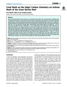While increasing atmospheric carbon dioxide (CO2) concentration alters global water chemistry (Ocean Acidification; OA), the degree of changes vary on local and regional spatial scales. Inshore fringing coral reefs of the Great Barrier Reef (GBR) are subjected to a variety of local pressures, and some sites may already be marginal habitats for corals. The spatial and temporal variation in directly measured parameters: Total Alkalinity (TA) and dissolved inorganic carbon (DIC) concentration, and derived parameters: partial pressure of CO2 (pCO2); pH and aragonite saturation state (Var) were measured at 14 inshore reefs over a two year period in the GBR region. Total Alkalinity varied between 2069 and 2364 mmol kg21 and DIC concentrations ranged from 1846 to 2099 mmol kg21 . This resulted in pCO2 concentrations from 340 to 554 matm, with higher values during the wet seasons and pCO2 on inshore reefs distinctly above atmospheric values. However, due to temperature effects, Var was not further reduced in the wet season. Aragonite saturation on inshore reefs was consistently lower and pCO2 higher than on GBR reefs further offshore. Thermodynamic effects contribute to this, and anthropogenic runoff may also contribute by altering productivity (P), respiration (R) and P/R ratios. Compared to surveys 18 and 30 years ago, pCO2 on GBR mid- and outer-shelf reefs has risen at the same rate as atmospheric values (,1.7 matm yr21 ) over 30 years. By contrast, values on inshore reefs have increased at 2.5 to 3 times higher rates. Thus, pCO2 levels on inshore reefs have disproportionately increased compared to atmospheric levels. Our study suggests that inshore GBR reefs are more vulnerable to OA and have less buffering capacity compared to offshore reefs. This may be caused by anthropogenically induced trophic changes in the water column and benthos of inshore reefs subjected to land runoff.