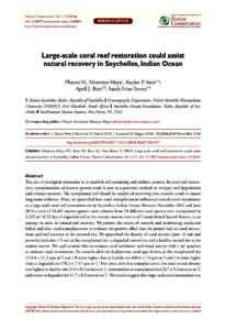 The aim of ecological restoration is to establish self-sustaining and resilient systems. In coral reef restoration, transplantation of nursery-grown corals is seen as a potential method to mitigate reef degradation and enhance recovery. The transplanted reef should be capable of recruiting new juvenile corals to ensure long-term resilience. Here, we quantified how coral transplantation influenced natural coral recruitment at a large-scale coral reef restoration site in Seychelles, Indian Ocean. Between November 2011 and June 2014 a total of 24,431 nursery-grown coral colonies from 10 different coral species were transplanted in 5,225 m2 (0.52 ha) of degraded reef at the no-take marine reserve of Cousin Island Special Reserve in an attempt to assist in natural reef recovery. We present the results of research and monitoring conducted before and after coral transplantation to evaluate the positive effect that the project had on coral recruitment and reef recovery at the restored site. We quantified the density of coral recruits (spat <1 cm) and juveniles (colonies 1-5 cm) at the transplanted site, a degraded control site and a healthy control site at the marine reserve. We used ceramic tiles to estimate coral settlement and visual surveys with 1 m2 quadrats to estimate coral recruitment. Six months after tile deployment, total spat density at the transplanted site (123.4 ± 13.3 spat m-2) was 1.8 times higher than at healthy site (68.4 ± 7.8 spat m-2) and 1.6 times higher than at degraded site (78.2 ± 7.17 spat m-2). Two years after first transplantation, the total recruit density was highest at healthy site (4.8 ± 0.4 recruits m-2), intermediate at transplanted site (2.7 ± 0.4 recruits m-2), and lowest at degraded site (1.7 ± 0.3 recruits m-2). The results suggest that large-scale coral restoration may have a positive influence on coral recruitment and juveniles. The effect of key project techniques on the results are discussed. This study supports the application of large-scale, science-based coral reef restoration projects with at least a 3-year time scale to assist the recovery of damaged reefs.