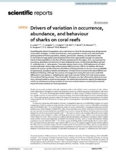 Quantifying the drivers of population size in reef sharks is critical for the development of appropriate conservation strategies. In north-west Australia, shark populations inhabit coral reefs that border growing centres of human population, industry, and tourism. However, we lack baseline data on reef sharks at large spatial scales (hundreds of km) that might enable managers to assess the status of shark populations in the face of future development in this region. Here, we examined the occurrence, abundance and behaviour of apex (Galeocerdo cuvier, Carcharhinus plumbeus) and reef (C. amblyrhynchos, C. melanopterus, Triaenodon obesus) sharks using > 1200 deployments of baited remote underwater stereo-video systems (stereo-BRUVs) across > 500 km of coastline. We found evidence for species-specific inƪuences of habitat and fishing activities on the occurrence (probability of observation), abundance (MaxN) and behaviour of sharks (time of arrival to the stereo-BRUVs and likelihood of feeding). Although the presence of management zoning (No-take areas) made little diơerence to most species, C. amblyrhynchos were more common further from boat ramps (a proxy of recreational fishing pressure). Time of arrival for all species was also inƪuenced by distance to boat ramp, although patterns varied among species. Our results demonstrate the capacity for behavioural metrics to complement existing measures of occurrence and abundance in assessing the potential impact of human activities on shark populations.