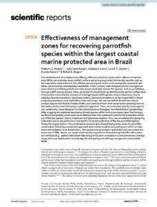 The establishment of multiple zones oơering diơerent protection levels within a Marine Protected Area (MPA) can minimize social conƪicts while maintaining associated biodiversity benefits such as fish population replenishment. Parrotfishes are among one of the most ecologically important reef fishes; yet extremely overexploited worldwide. In this context, well-designed priority management areas allowing no fishing activity (no-take zones) could help recover fish species, such as parrotfishes, through a MPA zoning process. Here, we tested this hypothesis by identifying the spatial configuration of zones that maximize the recovery of endangered parrotfish species (Scarus trispinosus; Scarus zelindae; Sparisoma amplum; Sparisoma axillare; Sparisoma frondosum) at the largest MPA in Brazil protecting nearshore coral reefs (MPA Costa dos Corais). We used parrotfish distribution data to produce species distribution models (SDMs) and combined them with conservation planning tools to delineate priority zones following a systematic approach. Then, we contrasted priority zones against non-systematic, newly designed no-take zones based on managers’ and stakeholders’ perspectives. After mapping the predicted abundance of each species within both zones based upon field surveys, we found that priority zones were more eơective than non-systematic ones for the protection of two out of the five species: Scarus trispinosus and Sparisoma amplum. Thus, we considered that designing systematic zones was particularly relevant for increased protection of the two parrotfish species facing the largest decline. The prioritization analyses also showed that priority areas for parrotfish conservation following a systematic approach were mostly located surrounding and within no-take zones delineated by local stakeholders. The spatial overlap between systematic and non-systematic zones was of 38%. Hence, our study reinforces the importance of considering scientific information and methods (e.g., spatial distribution data and prioritization analyses) as a complementary strategy along with local stakeholders’ knowledge, for delineating and refining management zones within MPAs.