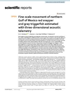 Red snapper and gray triggerfish are ecologically, economically, and culturally important reef fishes in the northern Gulf of Mexico (nGOM). Scientists and managers have sought to understand the eơects of artificial reefs on reef fish ecology by focusing on fish residency and movement at artificial reefs with less attention paid to broader spatial and temporal patterns in reef fish movements among a seascape of artificial reefs and other natural habitats. We used novel large‑scale (> 15 km2 ) geopositioning acoustic telemetry arrays to track the 3‑dimensional movements of tagged red snapper (n = 59) and gray triggerfish (n = 15) among multiple nGOM artificial reefs up to 333 days. Tagged fish moved frequently among artificial reefs and had shorter residence times at the release reef (43 days for red snapper and 3 days for gray triggerfish) than reported in previous studies. Both species displayed high individual variability in movement dynamics, as well as seasonally variable diel patterns of habitat use, height above bottom, and distance to reefs, which may have been driven by dynamic inƪuences of predation risk, physiological constraints, or foraging over time and space. The wider seascape view revealed in this study demonstrates the importance of including multiple artificial reefs over long timescales to capture individual, spatial, and temporal variability in reef fish movement.