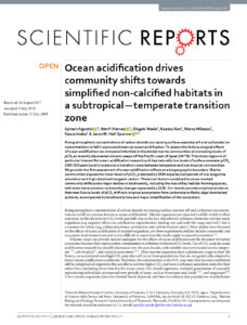 Rising atmospheric concentrations of carbon dioxide are causing surface seawater pH and carbonate ion concentrations to fall in a process known as ocean acidification. To assess the likely ecological effects of ocean acidification we compared intertidal and subtidal marine communities at increasing levels of pCO2 at recently discovered volcanic seeps off the Pacific coast of Japan (34° N). This study region is of particular interest for ocean acidification research as it has naturally low levels of surface seawater pCO2 (280–320µatm) and is located at a transition zone between temperate and sub-tropical communities. We provide the first assessment of ocean acidification effects at a biogeographic boundary. Marine communities exposed to mean levels of pCO2 predicted by 2050 experienced periods of low aragonite saturation and high dissolved inorganic carbon. These two factors combined to cause marked community shifts and a major decline in biodiversity, including the loss of key habitat-forming species, with even more extreme community changes expected by 2100. Our results provide empirical evidence that near-future levels of pCO2 shift sub-tropical ecosystems from carbonate to fleshy algal dominated systems, accompanied by biodiversity loss and major simplification of the ecosystem.