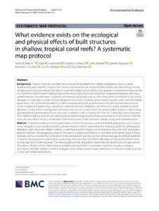 Shallow, tropical coral reefs face compounding threats from habitat degradation due to coastal development and pollution, impacts from storms and sea-level rise, and pulse disturbances like blast fishing, mining, dredging, and ship groundings that reduce coral reefs’ height and variability. One approach toward restoring coral reef structure from these threats is deploying built structures. Built structures range from engineered modules and repurposed materials to underwater sculptures and intentionally placed natural rocks. Restoration practitioners and coastal managers increasingly consider incorporating built structures, including nature-based solutions, into coral reef-related applications. Yet, synthesized evidence on the ecological and physical performance of built structure interventions across a variety of contexts (e.g., restoration, coastal protection, mitigation, tourism) is not readily available to guide decisions. To help inform management decisions, here we aim to document the global evidence base on the ecological and physical performance of built structures in shallow (≤ 30 m) tropical (35° N to 35° S latitude) coral ecosystems. The collated evidence base on use cases and associated ecological and physical outcomes of built structure interventions can help inform future consideration of built structures in reef restoration design, siting, and implementation.